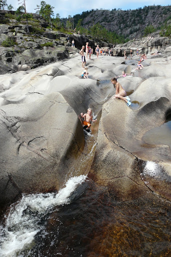 En dat samen vormt een geweldig zwem- en glijparadijs in de natuur. We zijn er 2 keer eerder geweest, maar vorig jaar zijn we er niet geweest omdat het toen het grootste deel van de zomer gesloten was als gevolg van teveel water (regen), waardoor het te gevaarlijk werd. Nu was het dus wel open, mooi weer en stervensdruk! Heel veel toeristen en dus ook heel veel Nederlanders. Het was super!
